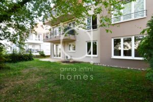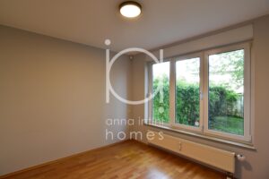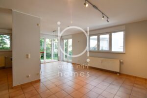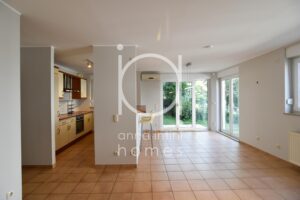 Il se compose comme suit : hall d’entrée, cuisine équipée ouverte sur living et salle à manger avec accès à la terrasse et au jardin privatif, deux chambres à coucher, salle de bains avec douche et baignoire, WC séparé, débarras avec buanderie, cave privative et un emplacement intérieur au sous-sol.