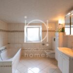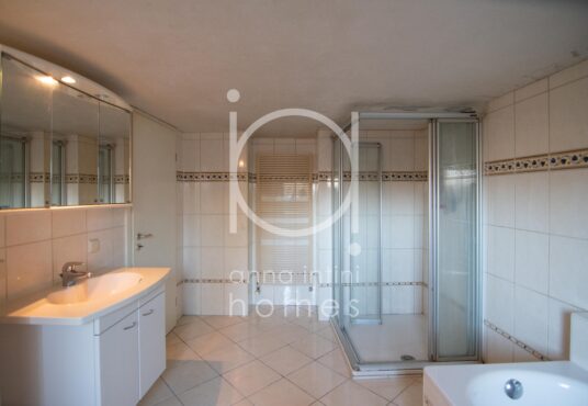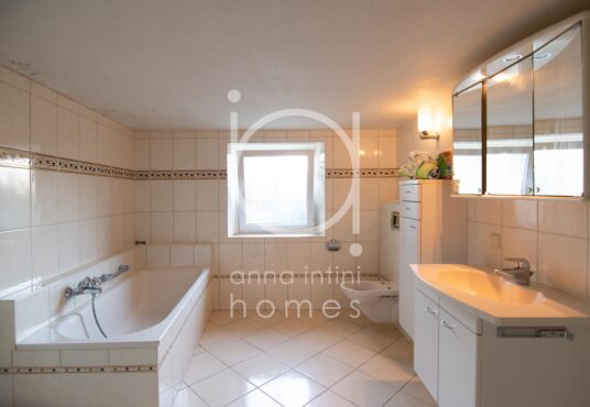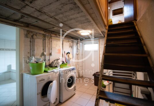 couloir avec espace buanderie donnant accès à la terrasse et au jardin, une salle de bains avec baignoire, douche, WC, meuble lavabo et une fenêtre ainsi qu’une chaufferie avec coin atelier et local technique.